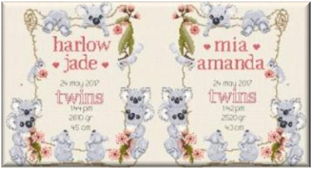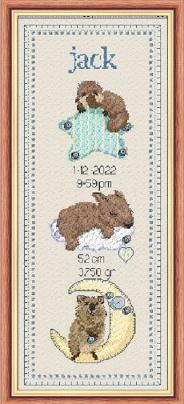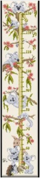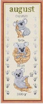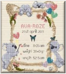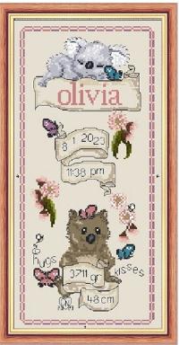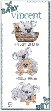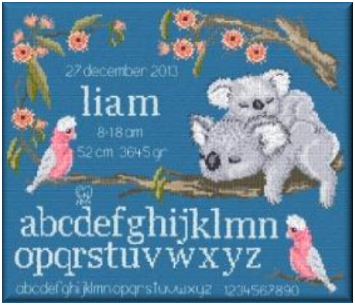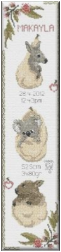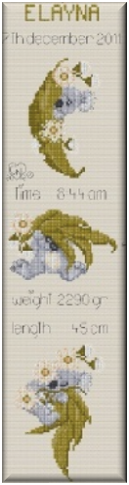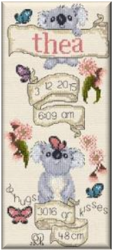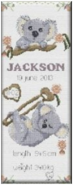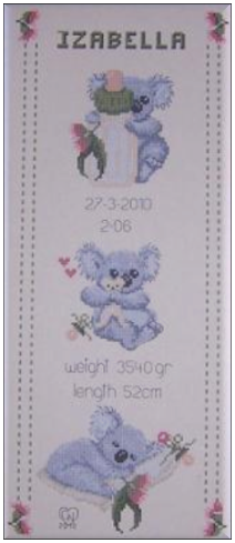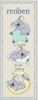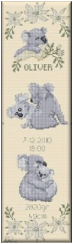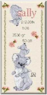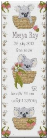 330.Koala Cuddles Birth Sampler 17x38cm $10 by email
