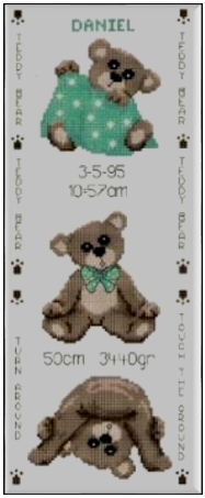 71.Teddy Bear Birth sampler 14x36cm $10 by email