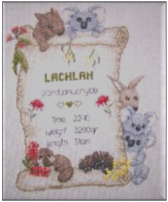 154. Koala Parchment Birth Sampler Design size 25 x 28 cm $10 by email