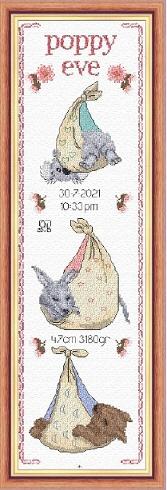 213. Peekaboo Birth Sampler 14x34cm $10 by email